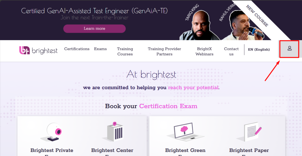 Để bắt đầu quá trình đăng ký thi bạn hãy truy cập vào trang https://brightest.org để bắt đầu nhé. Sau khi truy cập vào site bạn hãy click vào icon tài khoản như hình dưới