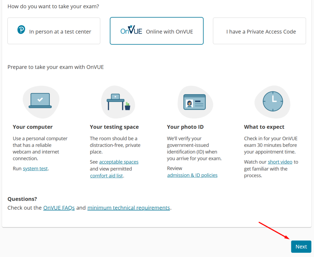 Ở hướng dẫn này mình sẽ chọn Online with OnVUE, đây là lựa chọn nếu bạn muốn làm bài thi tại nhà. sau đó chọn Next