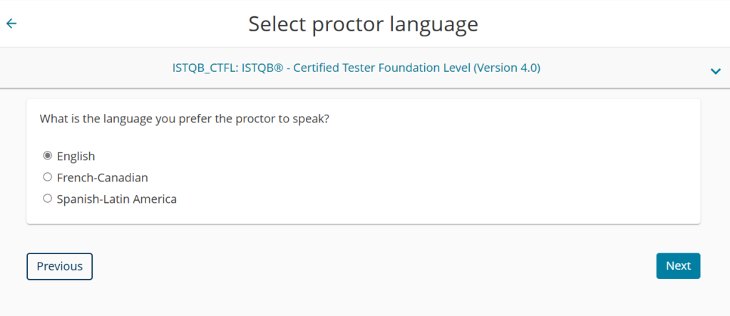 Sau đó đồng ý với các điều khoản của kỳ thi. Lúc này bạn chọn ngôn ngữ của giám thị trong kỳ thi của bạn. sau đó chọn “Next”