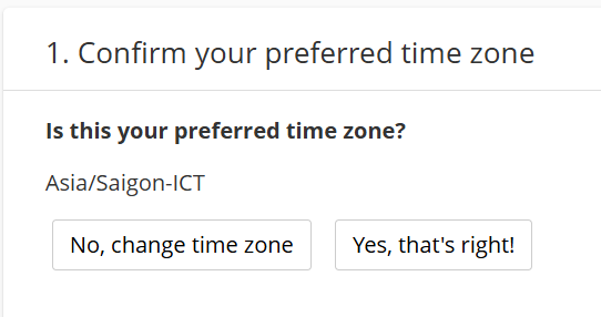 Chọn múi giờ, hãy chọn đúng múi giờ để tránh nhầm lẫn cho kỳ thi của bạn, nếu ở Việt Nam múi giờ là “Asia/Saigon-ICT”. Thay đổi xong, hãy chọn “Yes, that’s right!”