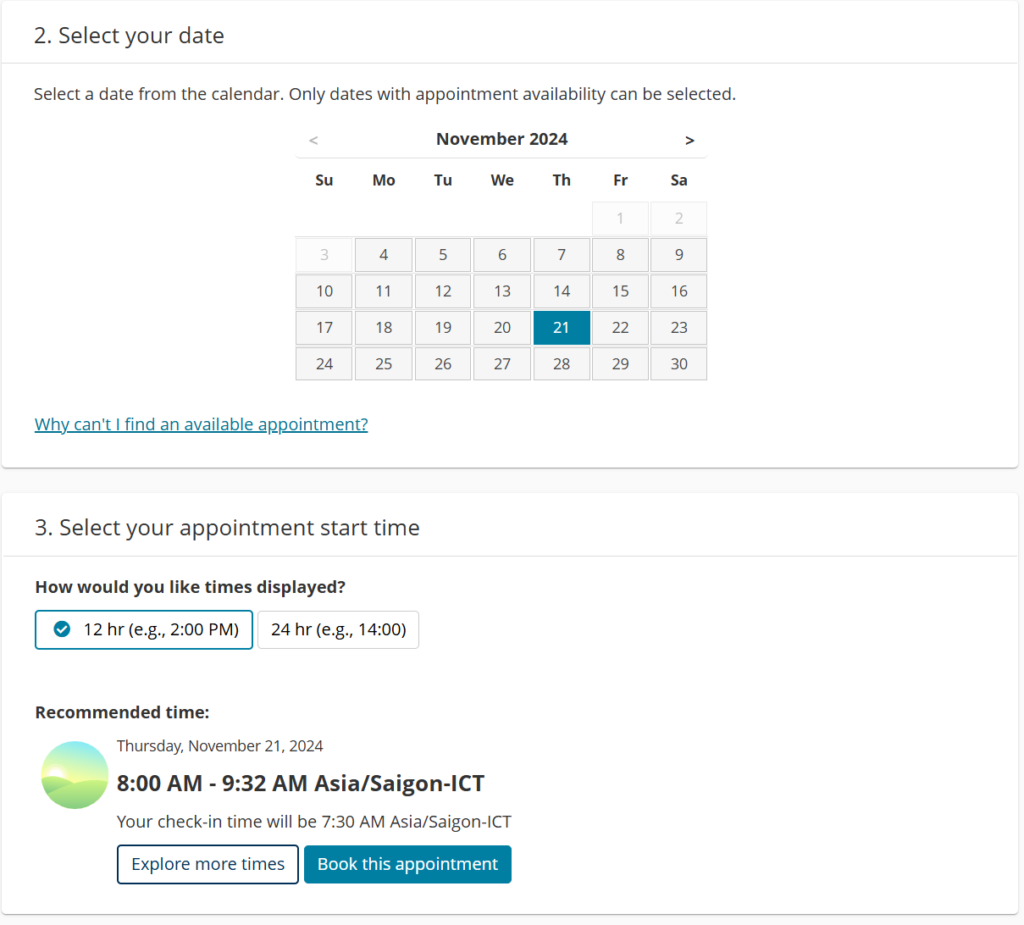 Với thi tại nhà thì cứ 15 phút lại có 1 khung giờ để bạn chọn. Hãy chọn thời gian phù hợp với mình. Sau đó click “Book this appointment”