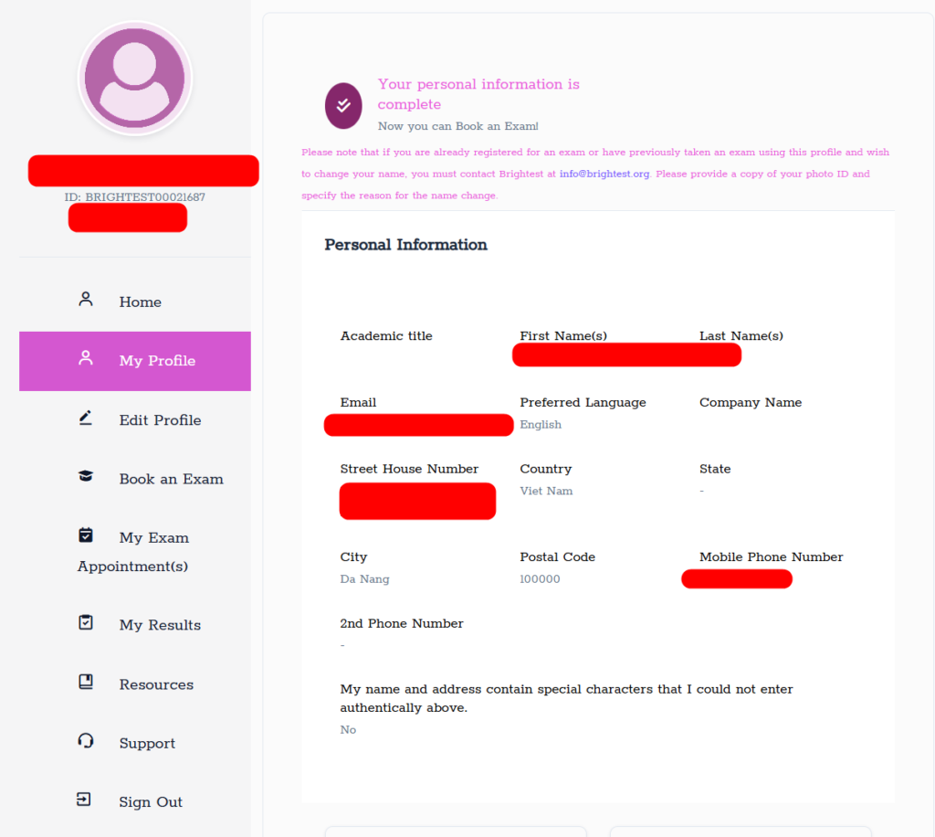 Sau khi thêm đầy đủ thông tin thì bạn sẽ nhận được thông báo “Now you can Book an Exam!” như hình