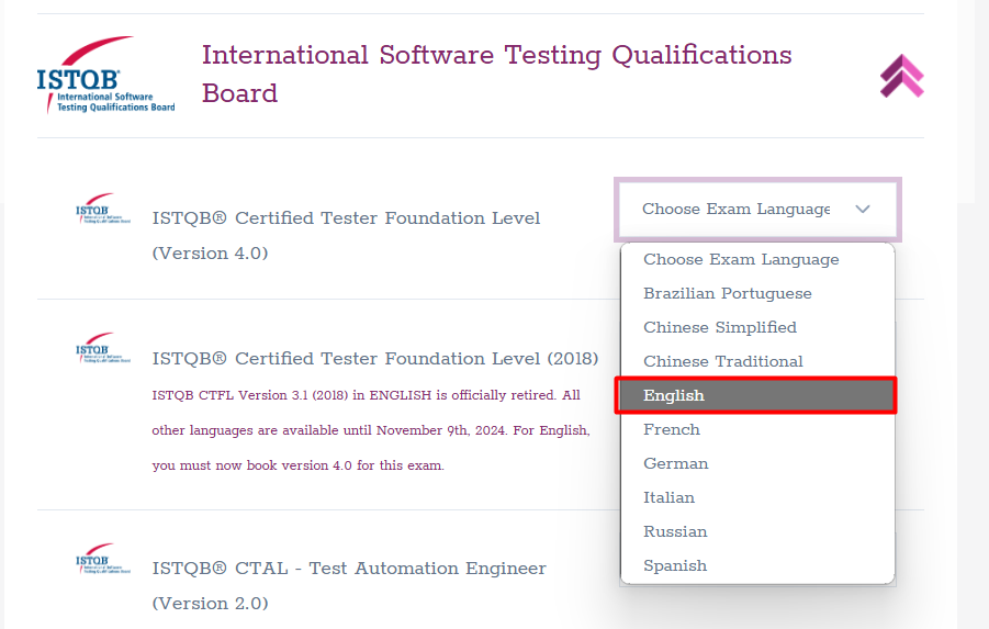 Lúc này trang sẽ hiển thị đầy đủ các chứng chỉ được Brightest cung cấp, ISTQB ở phía dưới danh sách nên bạn hãy cuộn xuống và chọn nhé. Sau khi click vào ISTQB hãy chọn chứng chỉ bạn muốn thi và ngôn ngữ tương ứng nhé