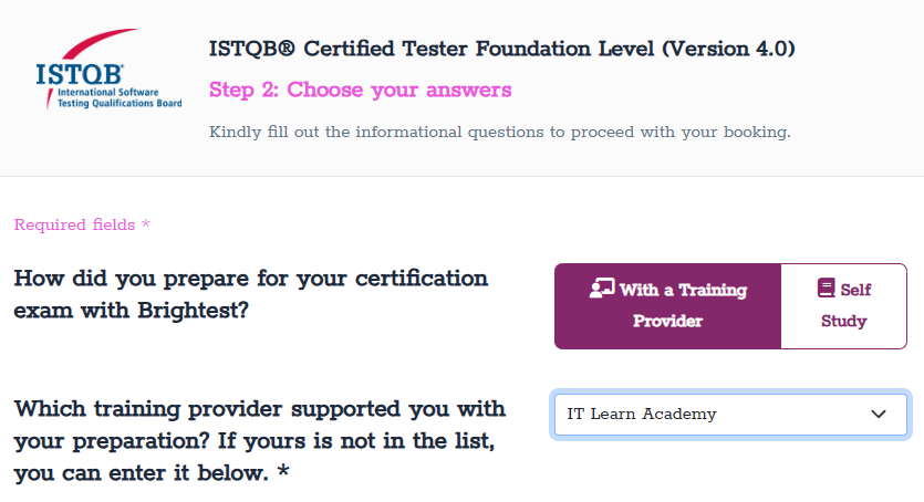 Câu hỏi: How did you prepare for your certification exam with Brightest?, hãy nếu tự học hãy chọn “Self study”, nếu học tại trung tâm hãy chọn “With training provider” và chọn từ danh sách các trung tâm được liệt kê, VD ở đây là IT Learn.