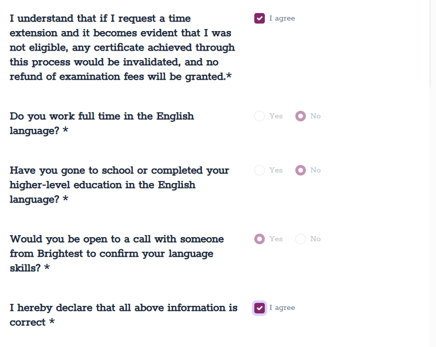 [QUAN TRỌNG] Câu hỏi: “Is English Your Native Language ?”. Với thi ISTQB bạn sẽ được thêm 15 phút nếu tiếng Anh không phải là tiếng bản ngữ của bạn, nên hãy chọn “No” ở câu hỏi này. Sau đó chúng ta sẽ trả lời một loạt câu hỏi xác nhận liên quan tới ngôn ngữ hãy chọn các lựa chọn như hình nhé.