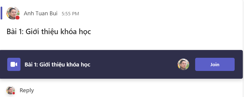 - Buổi học: Nơi tổ chức các buổi học, mỗi một buổi học sẽ là một buổi meeting trên channel này. Bạn sẽ tham gia vào các buổi meeting để tham gia buổi học (cả online và offline).