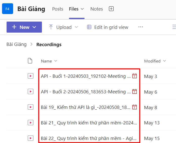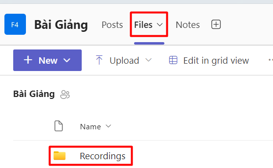 Để xem lại bài giảng bạn truy cập vào channel “Bài Giảng”, phía trên của channel có tab “Files”, các bạn click vào đây. Trong phần này bạn sẽ thấy folder “Recordings” khi click vào đây bạn sẽ thấy các video ghi hình bài học