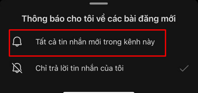 Bước 3: Tap vào “Thông báo cho tôi về các bài đăng mới” và chuyển sang tùy chọn “Tất cả các tin nhắn mới trong kênh này”