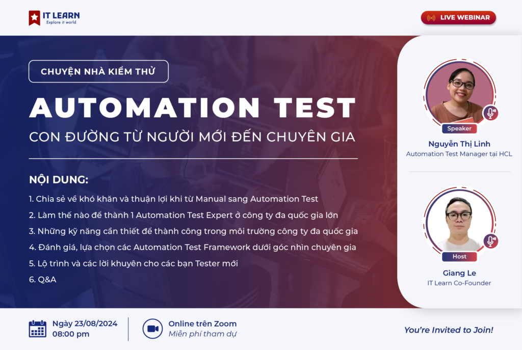 Nhằm hỗ trợ những người mới bắt đầu và những tester muốn nâng cao kỹ năng của mình trong lĩnh vực kiểm thử tự động, chúng tôi hân hạnh tổ chức webinar mang tên “Automation Test – Con Đường Từ Người Mới Đến Chuyên Gia”. Trong webinar này, chúng tôi sẽ cung cấp cái nhìn tổng quan về tầm quan trọng của kiểm thử tự động trong quá trình phát triển phần mềm và cách mà nó có thể nâng cao hiệu suất làm việc. Các diễn giả sẽ chia sẻ những kinh nghiệm thực tế, những thách thức và cách vượt qua khó khăn khi chuyển từ kiểm thử thủ công sang kiểm thử tự động. Chúng tôi cũng sẽ trả lời câu hỏi mà các bạn thắc mắc về quá trình chuyển đổi để giúp bạn có được sự chuẩn bị tốt hơn.